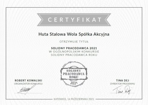 Huta Stalowa Wola S.A. otrzymała prestiżowe wyróżnienie Solidny Pracodawca roku 2021.