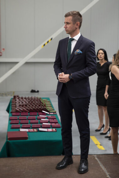 Następnie rozpoczęła się uroczystość wręczenia odznaczeń w obecności Zarządu, pracowników i gości. Wśród gości obecni byli: Senator RP Janina Sagatowska, Poseł RP i Sekretarz Stanu w Ministerstwie Infrastruktury Rafał Weber, Wicewojewoda Podkarpacki Radosław Wiatr, Starosta Stalowolski Janusz Zarzeczny, władze miasta Stalowa Wola: Przewodniczący Rady Miasta Stanisław Sobieraj oraz Prezydent Lucjusz Nadbereżny, Pułkownik Paweł Wójcik, Szefa Ośrodka Zamiejscowego w Rzeszowie Centralnego Wojskowego Centrum Rekrutacji oraz organy reprezentujące Hutę Stalowa Wola S.A. – Zarząd Huty Stalowa Wola – Jan Szwedo Prezes Zarządu, Janusz Hamryszczak, Członek Zarządu, Dyrektor Finansowy, Robert Pacana Członek Zarządu, Dyrektor Korporacyjny oraz Członek Rady Nadzorczej Huty Stalowa Wola S.A. Franciszek Zaborowski.