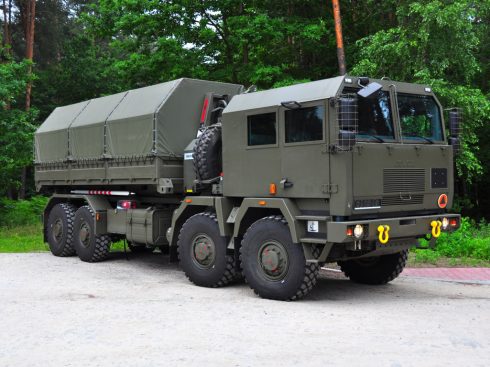 Artillery Ammunition Vehicles are part of the RAK Company Fire Module. AAV is based on the JELCZ 882.53 truck, with a two-person armored cab. The chassis is equipped with a hook container loading system, an on-board set of internal and external communication devices, a filtering device, a satellite navigation receiver and a machine gun stand. Body equipment consists of 6 special pallets for transporting 120 mm ammunition.