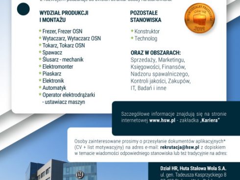 Already this year, waiting for people willing to take up employment at HSW S.A. are even several dozen jobs in various production and corporate specialties.