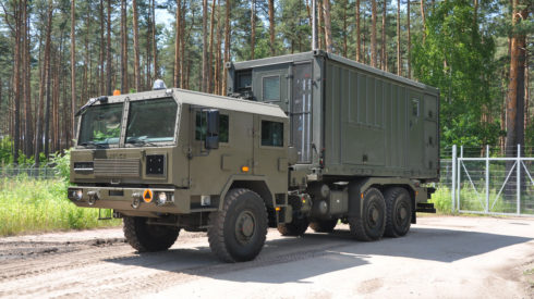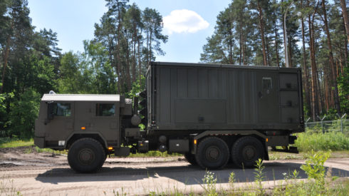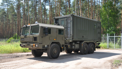 PODWOZIE SAMOCHODU CIĘŻAROWEGO 6×6 JELCZ P662D.35 przystosowane do jazdy w warunkach terenowych. Czteroosobowa kabina opancerzona wyposażona jest w nawigację satelitarną, pokładowy zestaw urządzeń łączności wewnętrznej FONET, radiostację pokładową UKF oraz urządzenie filtrowentylacyjne zapewniające nadciśnienie min. 200 Pa.